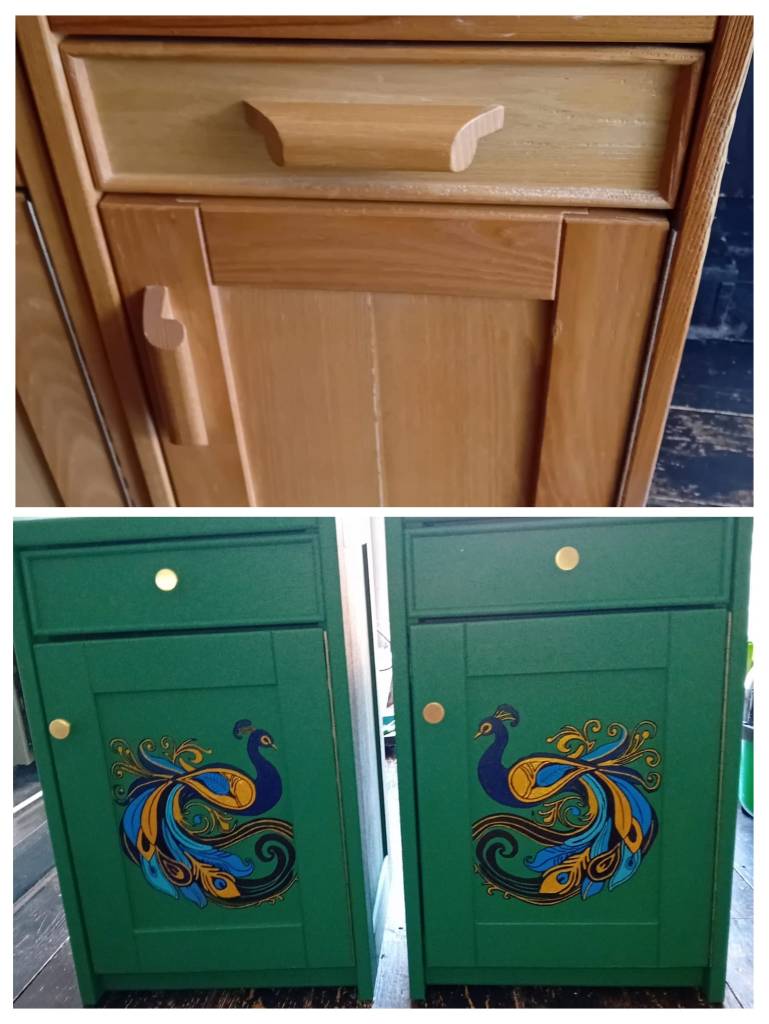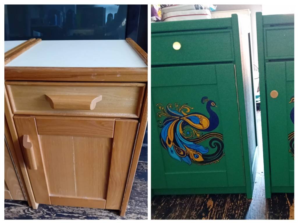 This mirrored pair of bedside cabinets began as forgotten pieces—and now glow with renewal. Painted in rich greens and blues, each peacock faces its twin—beautifully similar, never identical.